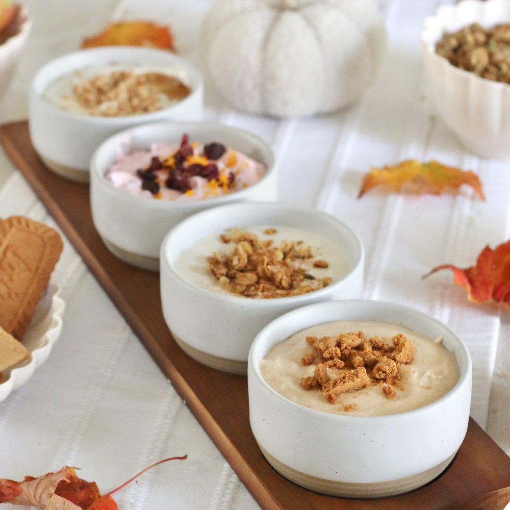 Fall is bursting with cozy flavors, and this yogurt dip flight brings them all together in one colorful, crowd-pleasing spread. From Pumpkin Spice to Cranberry Walnut, each creamy skyr dip is simple to make, fun to share, and the perfect way to sweeten any gathering—or a cozy afternoon snack.Â