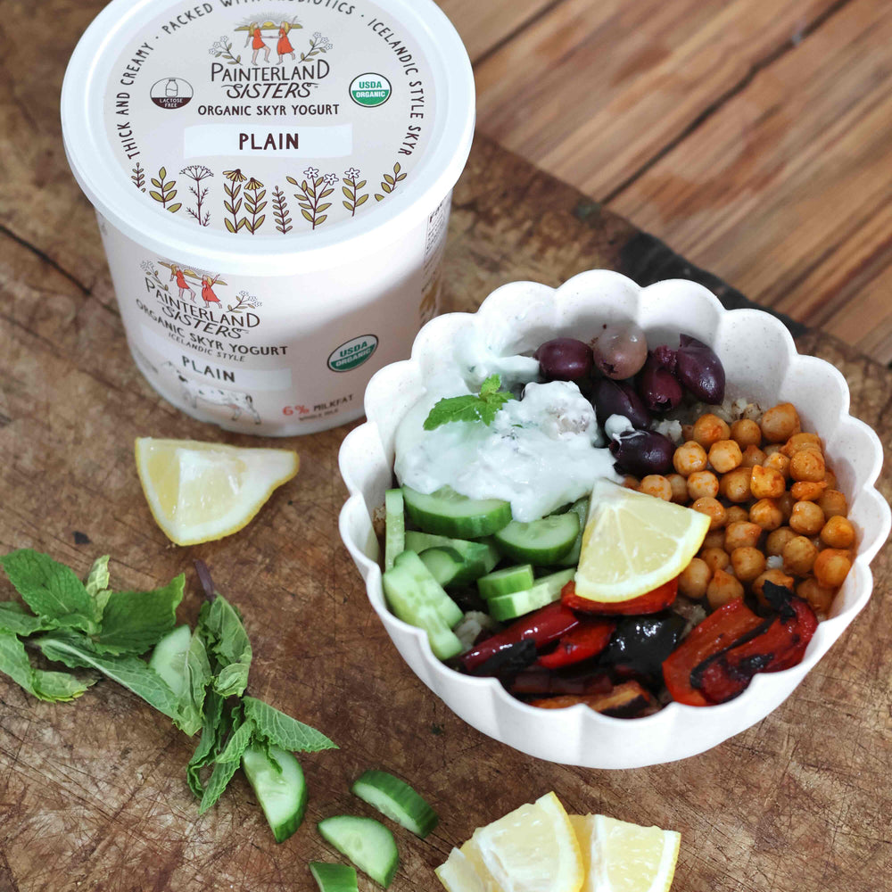 Fresh, vibrant, and packed with fiber, this Mediterranean-inspired bowl features hearty grains, crisp vegetables, and a bright lemon-mint sauce made with creamy Painterland Sisters Plain Skyr for a nourishing, satisfying meal!